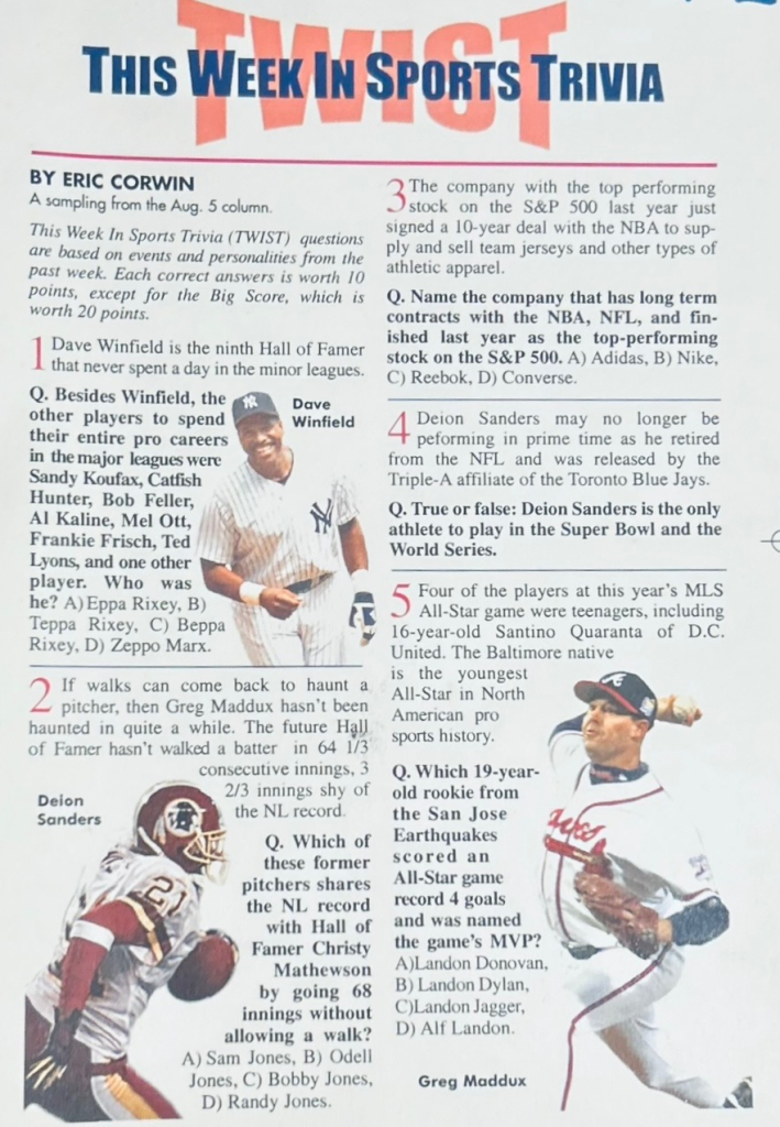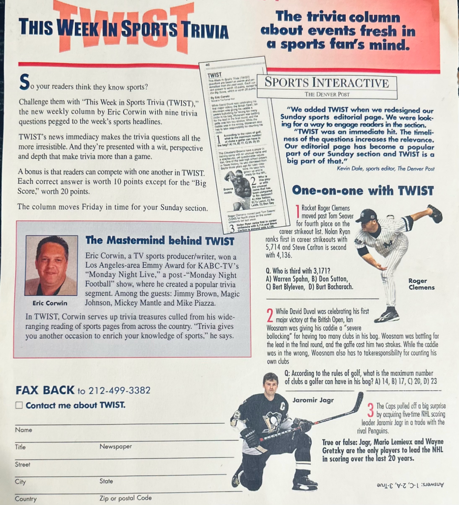 This Week In Sports Trivia – also known by the acronym TWIST – quickly built a following with readers in the Sunday Denver Post, and the weekly sports column proved so popular with casual and diehard fans that within the first year it was picked up by a syndicate for national distribution.